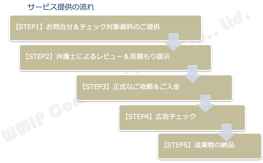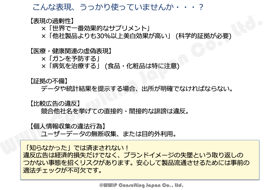 本サービスは、流通・掲載前の広告・宣伝内容に関して、専門家(中国現地の弁護士)が広告表現を精査することで、企業のリスク管理と市場参入の円滑化を支援するものです。中国でビジネス展開する企業様は、広告宣伝開始前に是非本サービスをご活用ください。